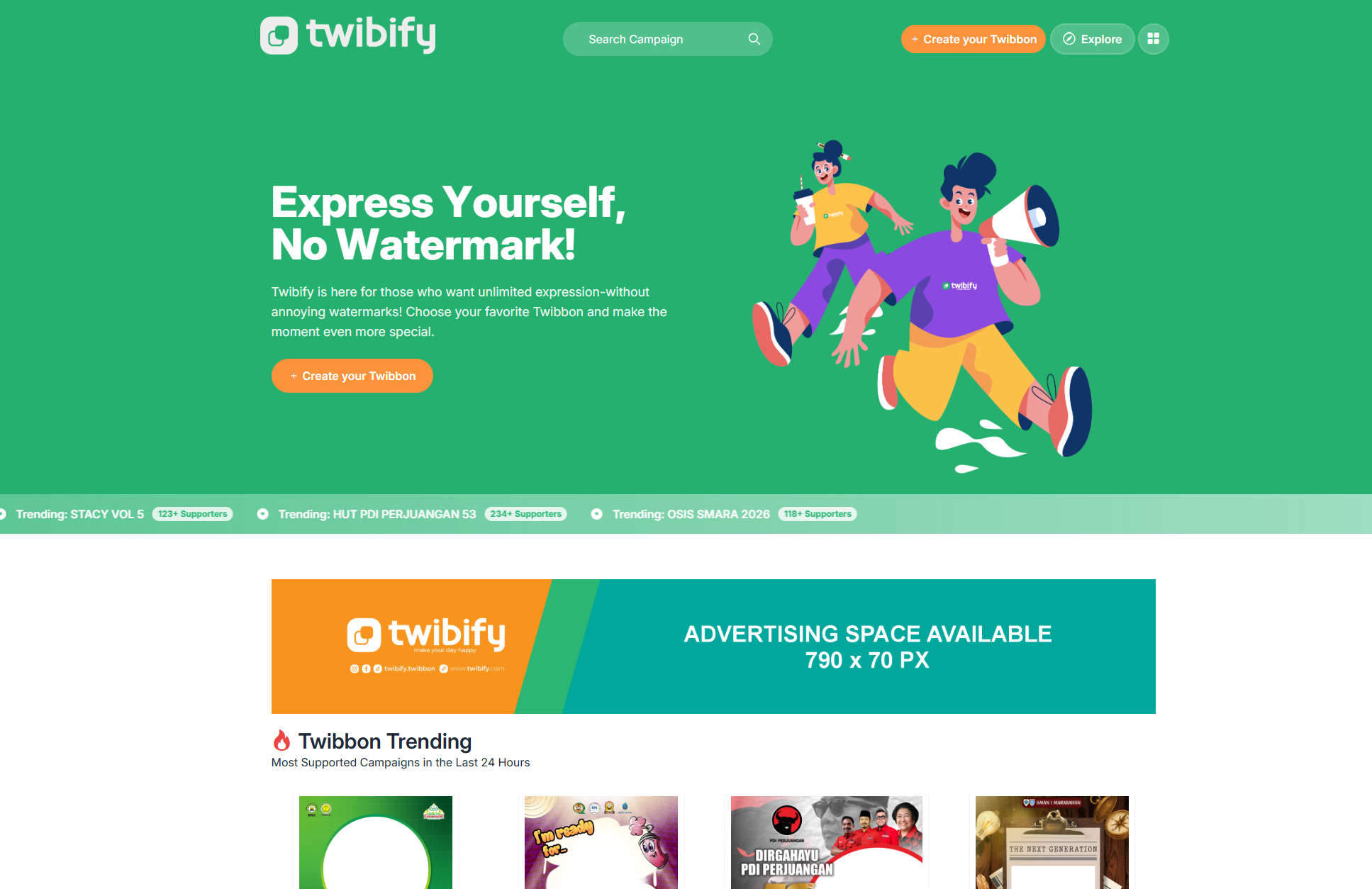 Twibify.com adalah platform online penyedia layanan Twibbon yang memungkinkan pengguna membuat campaign digital tanpa perlu aplikasi tambahan. Dengan Twibify.com, Twibbon bisa langsung digunakan melalui browser dan dibagikan ke berbagai media sosial.